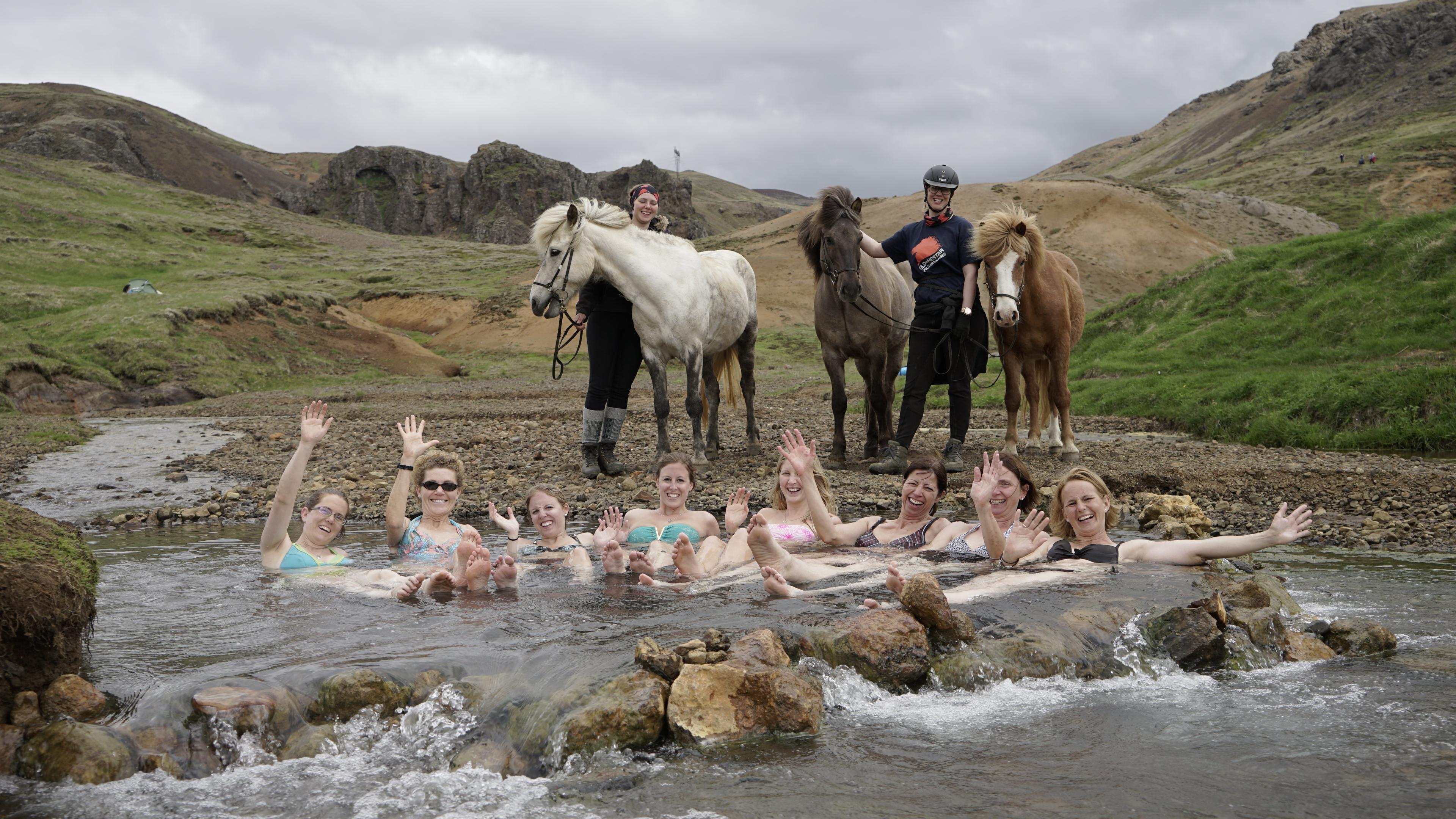På våra ridturer är baden en naturlig del av upplevelsen. Det kan vara den klassiska heita pottur – den isländska badtunnan – där man sitter under bar himmel, ofta med utsikt över fjäll eller dalgångar. Vattnet värms av jordens egen energi, och det finns få saker som slår känslan av att sjunka ner i varmt vatten medan kvällsljuset långsamt glider över landskapet.