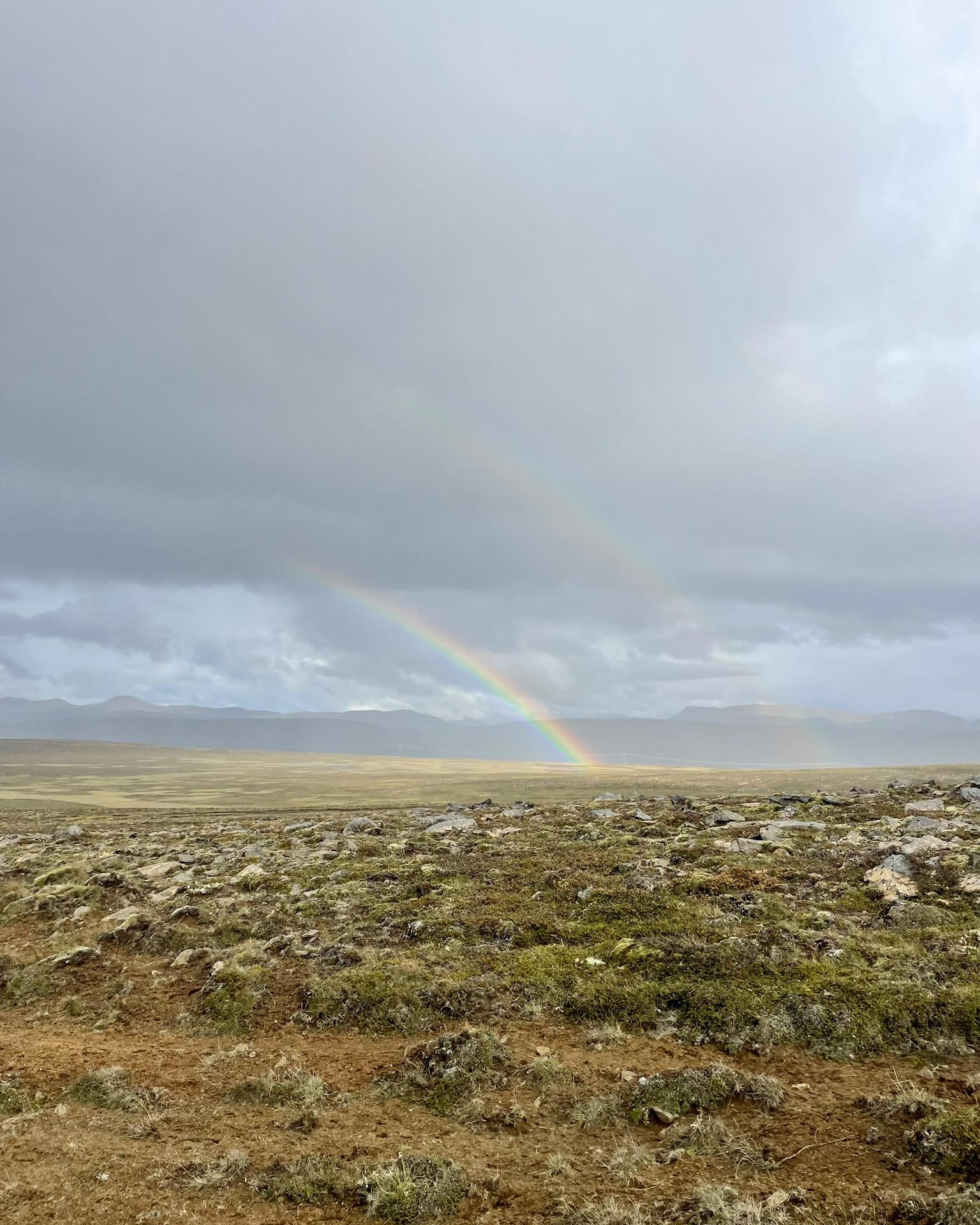 Dagen började med att vi red tillsammans med en flock på 60 hästar från Kárdalstunga upp i höglandet. Att se flocken följa oss var som en levande målning. Strax innan vi mötte fårbönderna dök plötsligt dubbla regnbågar upp – ett magiskt ögonblick. Utsikten var vidunderlig: mjölkvita moln, sol och regn i ett ständigt skiftande landskap.