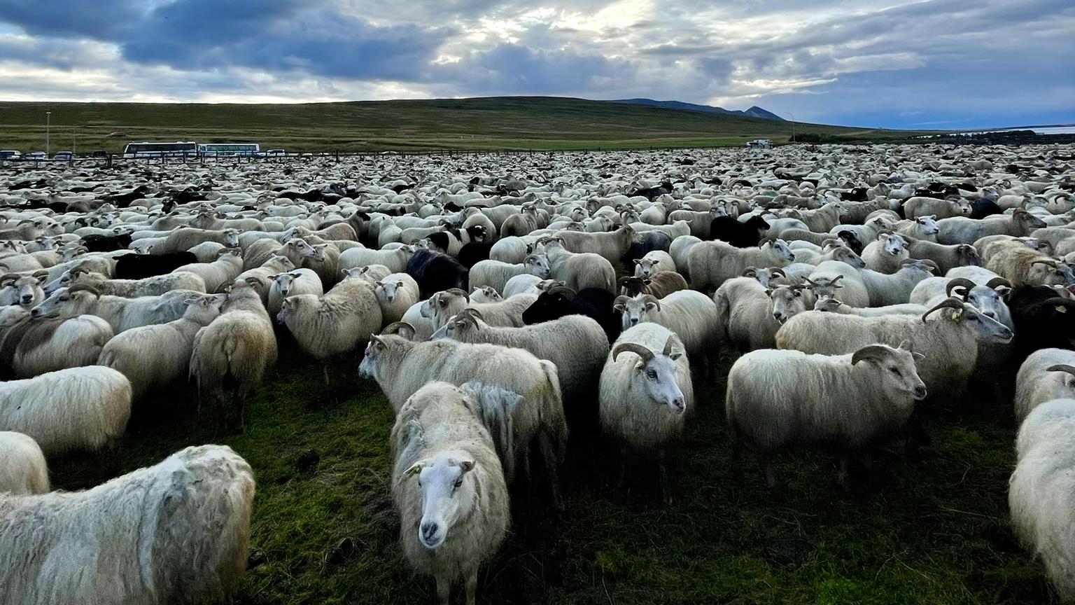 Vi mötte sedan upp fårbönder som under flera dagar samlat ihop sina får, mellan 8000 och 10 000 djur! Det var en häftig upplevelse att få vara en del av de ryttare som föste fåren ner i dalen mot fållan. Hundar, hästar, massor av får, isländska rop, sång och skratt – en genuin och levande tradition.
