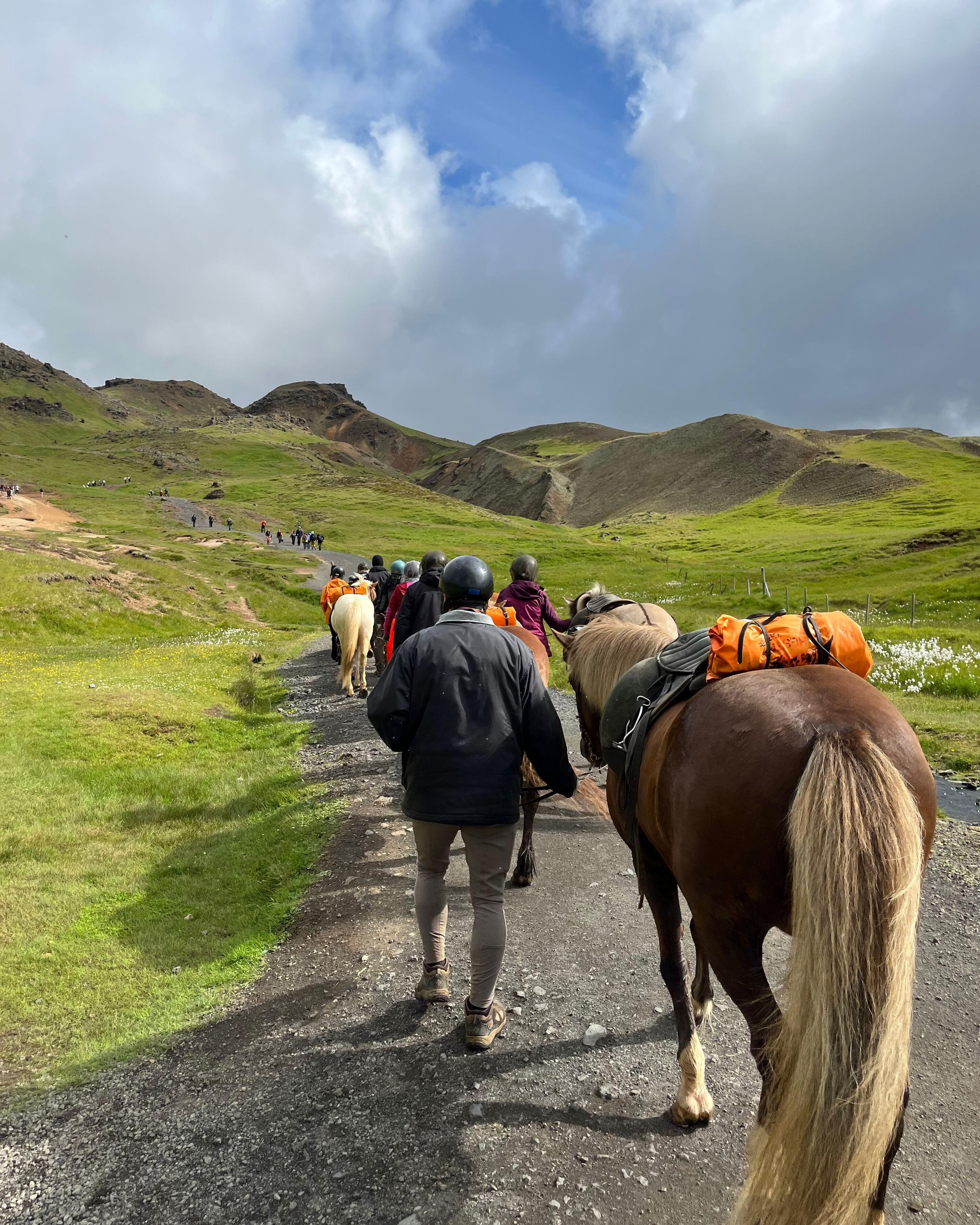 Vi red längs det mäktiga berget bland stenar och betande får. På vägen tillbaka till gården red vi längs Reykjafjall med fin utsikt över dalen. Dagen bjöd på mycket tölt och strålande sol, och vi kunde till och med se vulkanerna Hekla och Eyjafjallajökull i fjärran. En underbar dag på hästryggen!