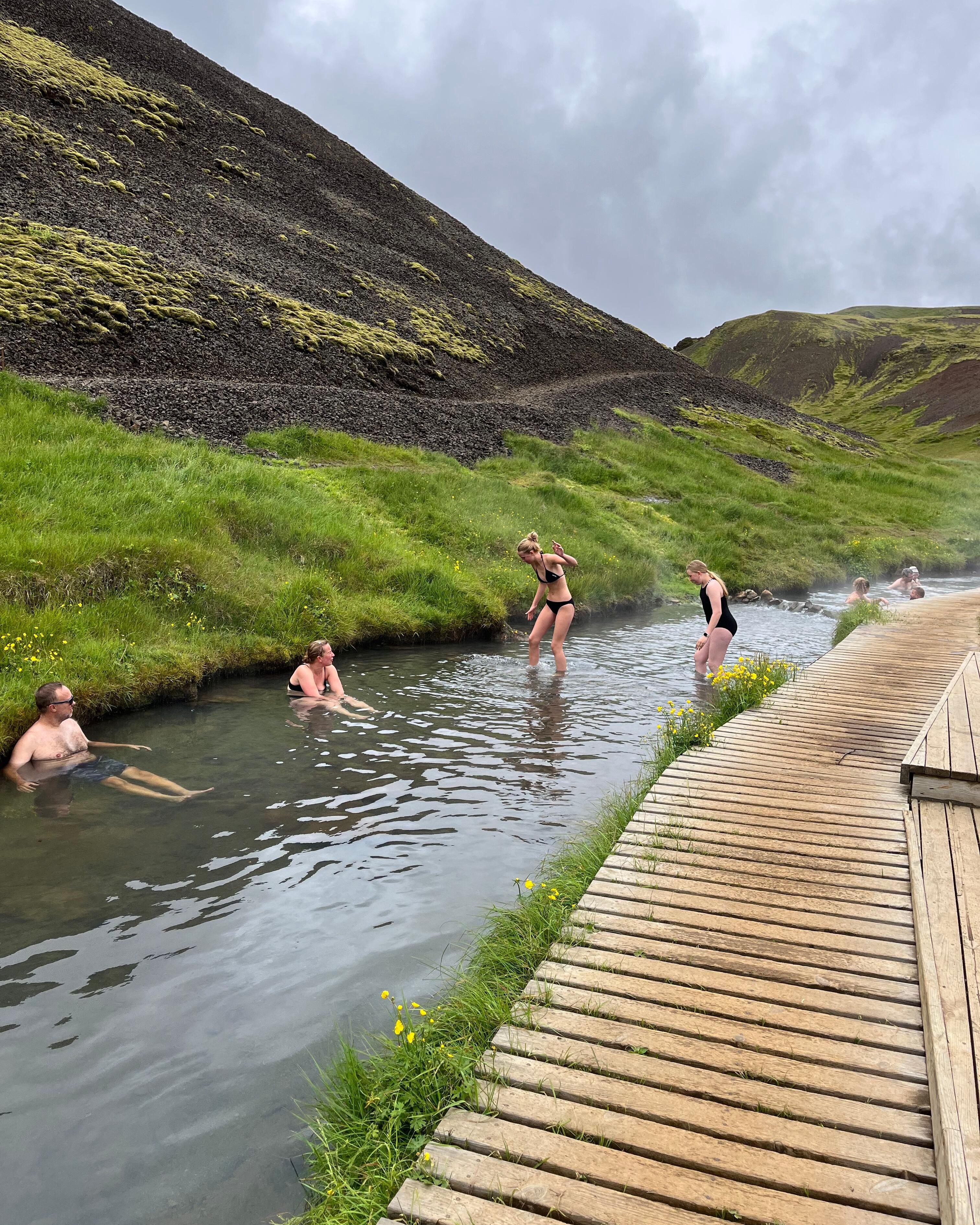 Efter frukost gav vi oss iväg mot bergen. Vi följde kanten av berget Reykjafjall och älven som rinner från toppen ner mot byn Hveragerði. Vi red på fina stigar, genom skog och över vattendrag, ända upp till dalen Reykjadalur där vi badade i den varma bäcken. Solen sken och vi hade fantastisk utsikt över Hveragerði, dalarna och bergen. Väl hemma på gården efter en härlig dag med fina hästar väntade fika, varmt bad och en god middag.