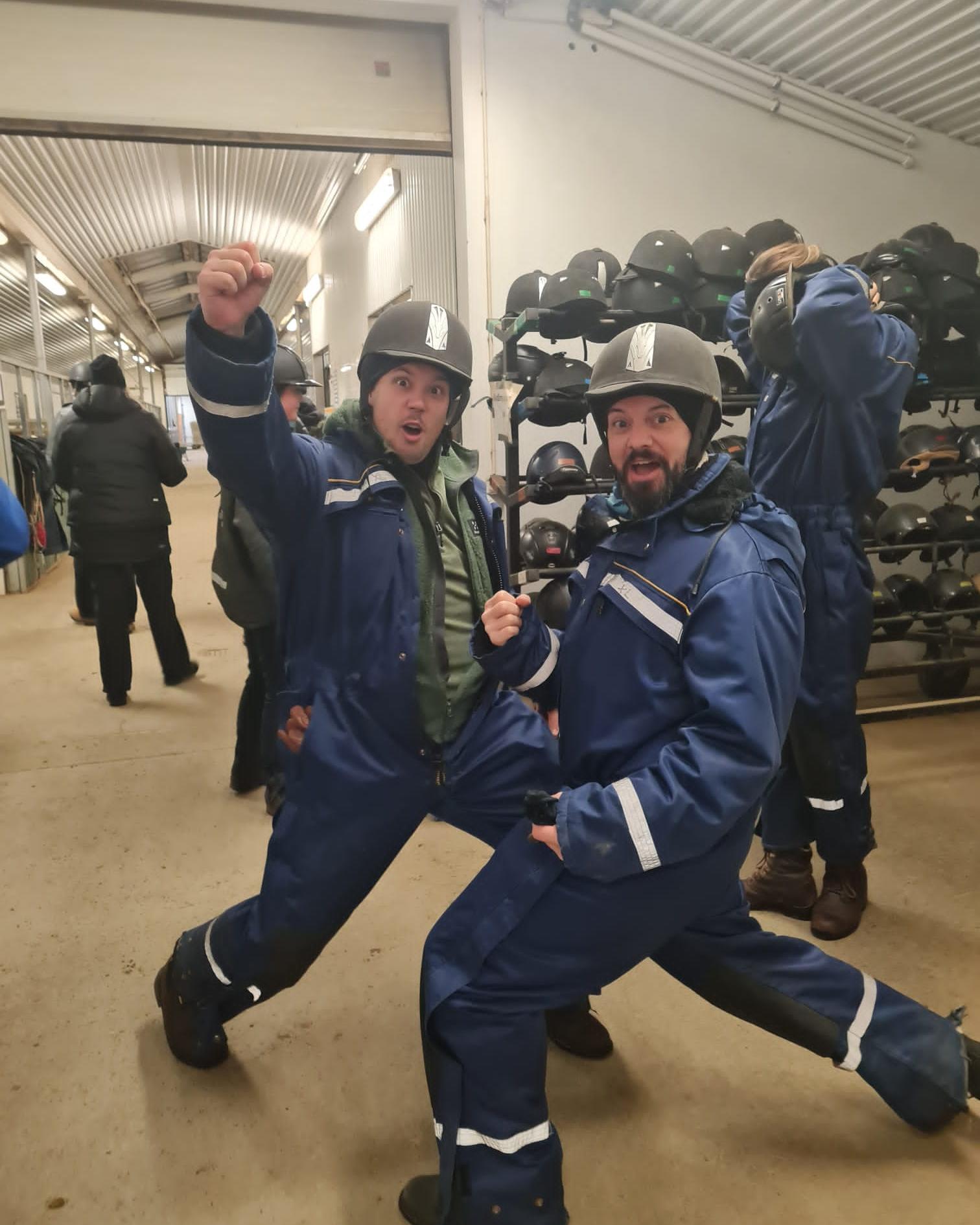 Då du rider en vintertur finns det varma ridoveraller att låna.