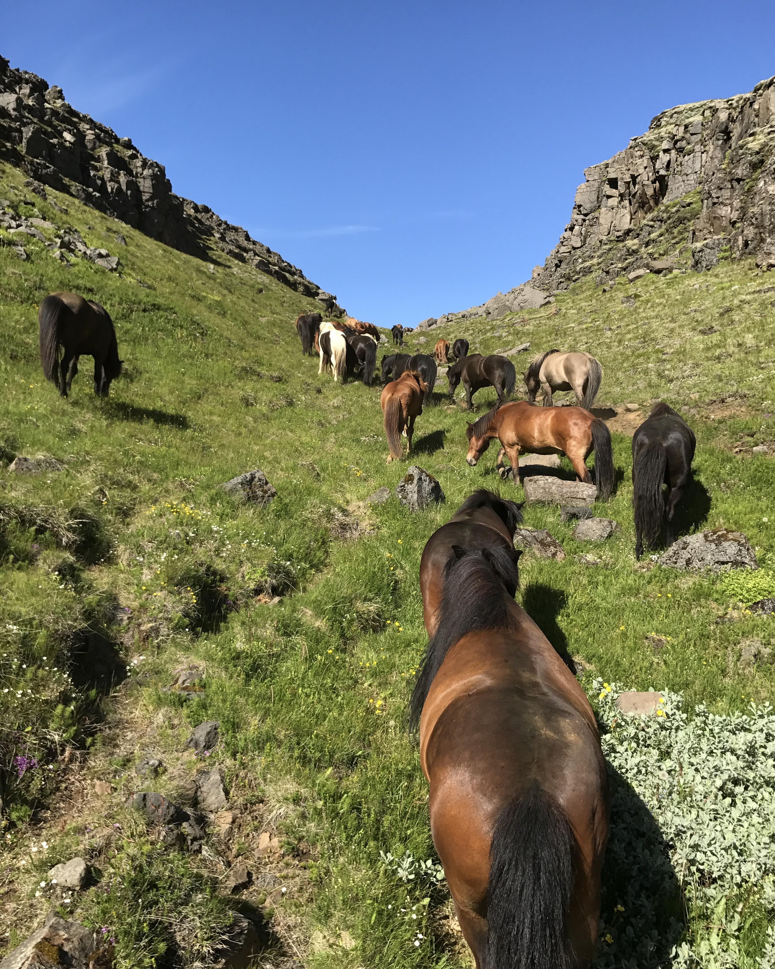 Här upplever vi det som gör ridningen på Island så speciell – samspelet mellan häst och ryttare, rytmen i tölten när flocken rör sig fritt över de öppna vidderna och den varma gemenskapen mellan reskamrater som delar samma passion. Varje dag bjuder på nya landskap: djupa raviner, mjuka mossklädda kullar och den stilla storheten under Kerlingarfjölls mäktiga siluett.